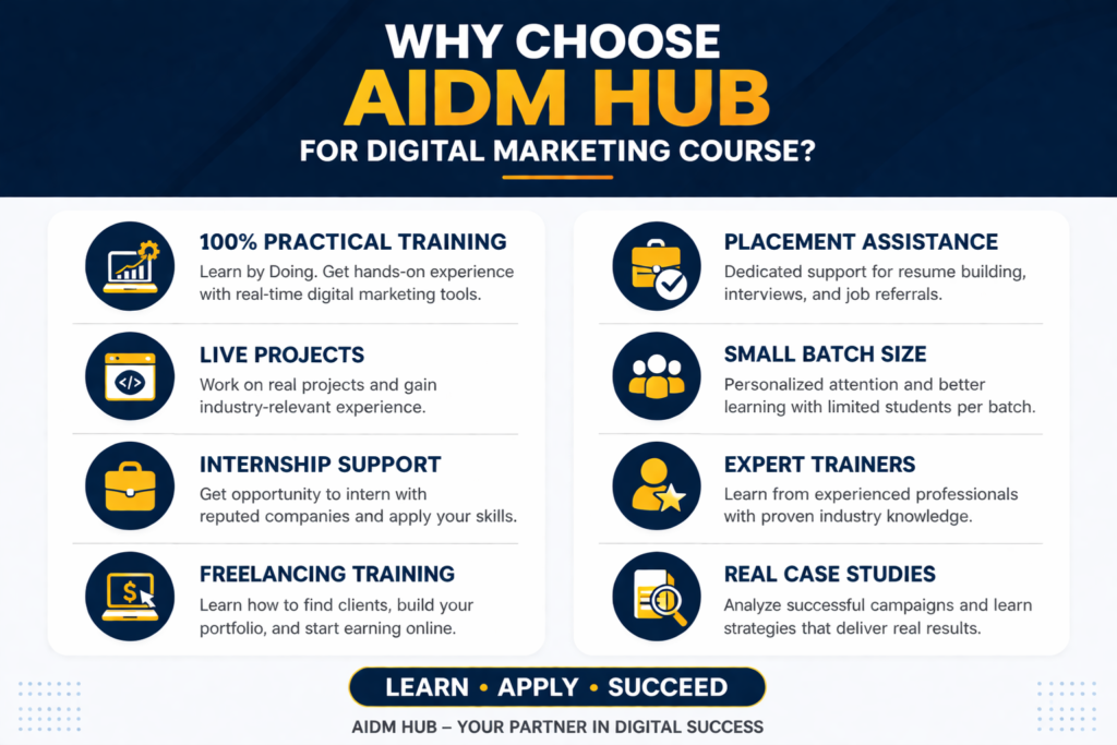 At AIDM HUB, we focus on hands-on learning, helping students master SEO, Google Ads, social media marketing, and website development with real-time experience.
